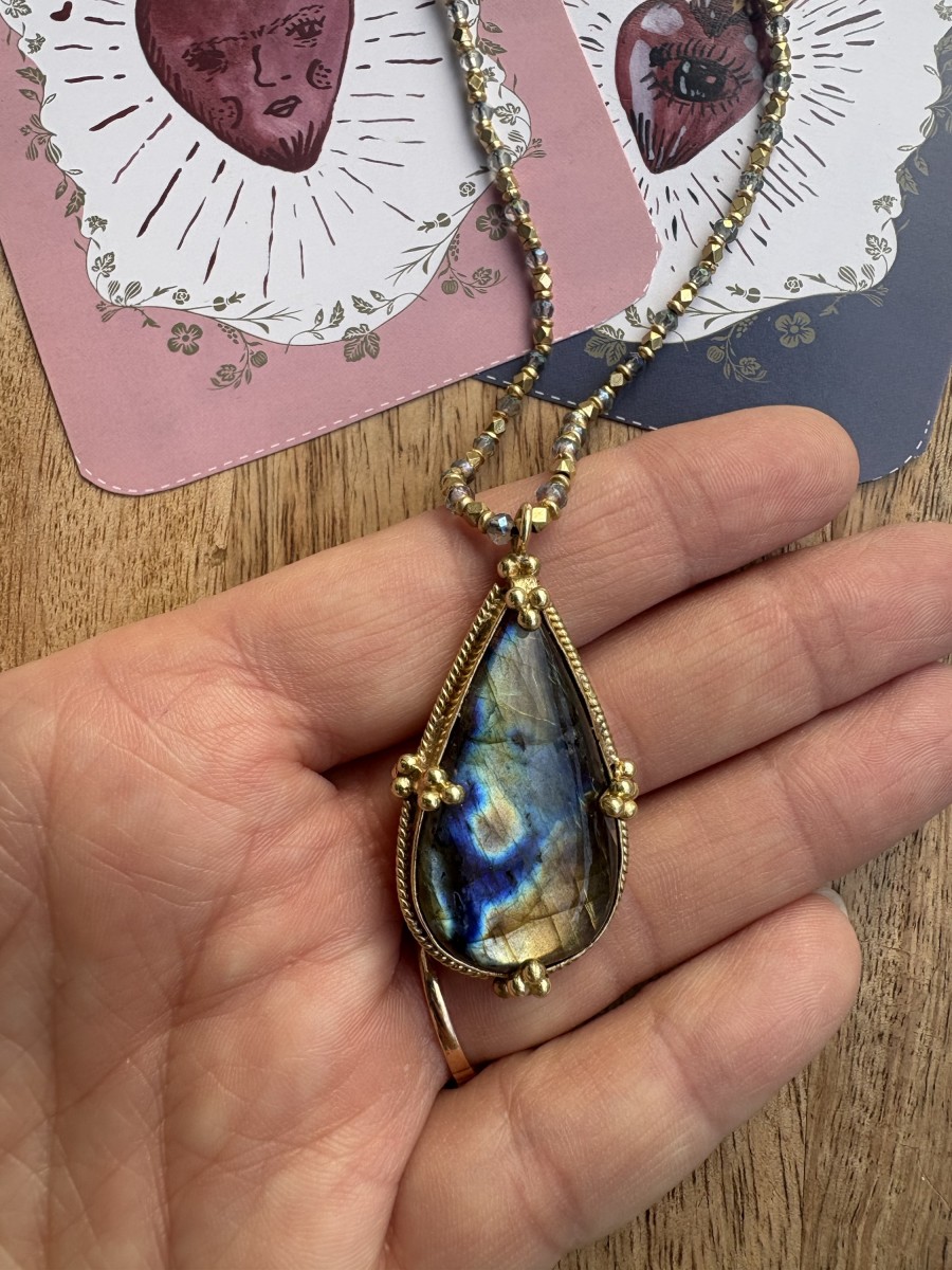 Un bijou qui habille la vie de tous les jours tout en conservant une présence symbolique. La labradorite capte la lumière et crée un jeu de reflets unique, faisant de chaque exemplaire une pièce singulière.